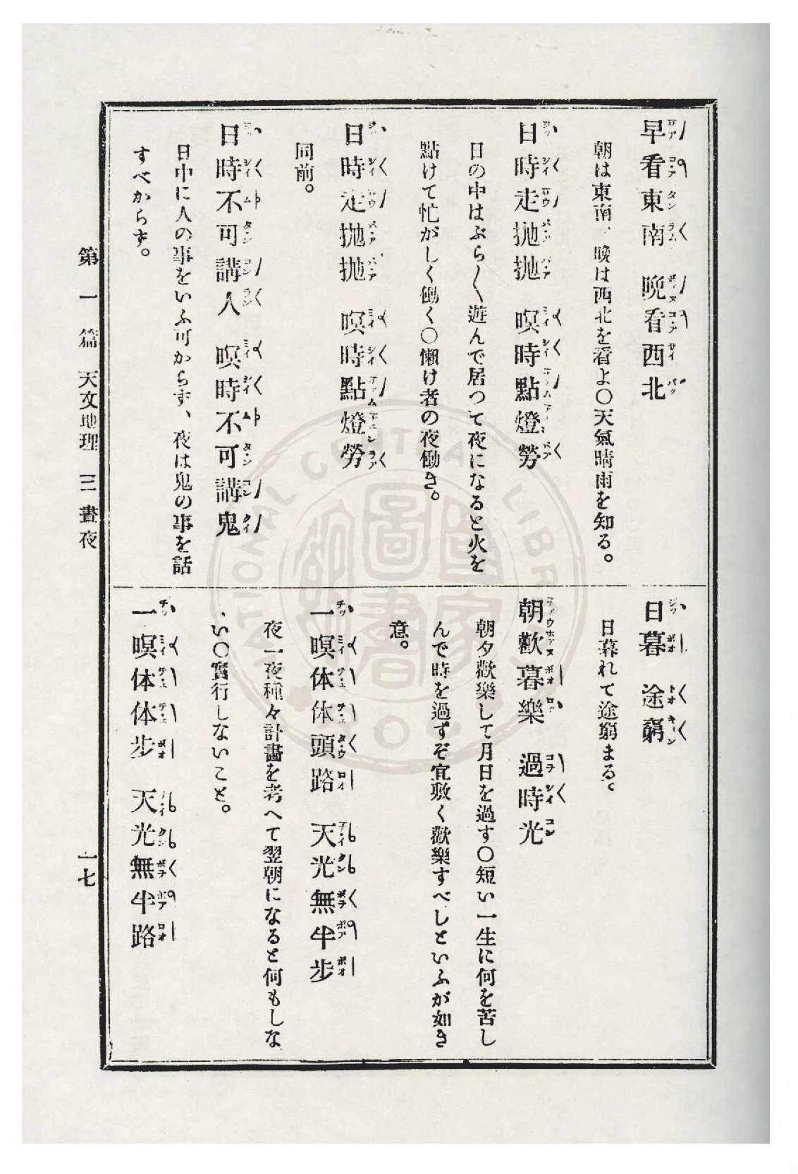 | 215 | 早看東南,晚看西北 | Chá khòaⁿ tanglâm, boán khòaⁿ saipak. | 早起時tio̍h看東南,暗時tio̍h看西北。Ánne thang知氣象。 | Chákhísî tio̍h khòaⁿ tanglâm, àmsî tio̍h khòaⁿ sai pak. Ánne thang chai khìsiōng. | 晝夜 | Tiùiā | 原冊掃描 |