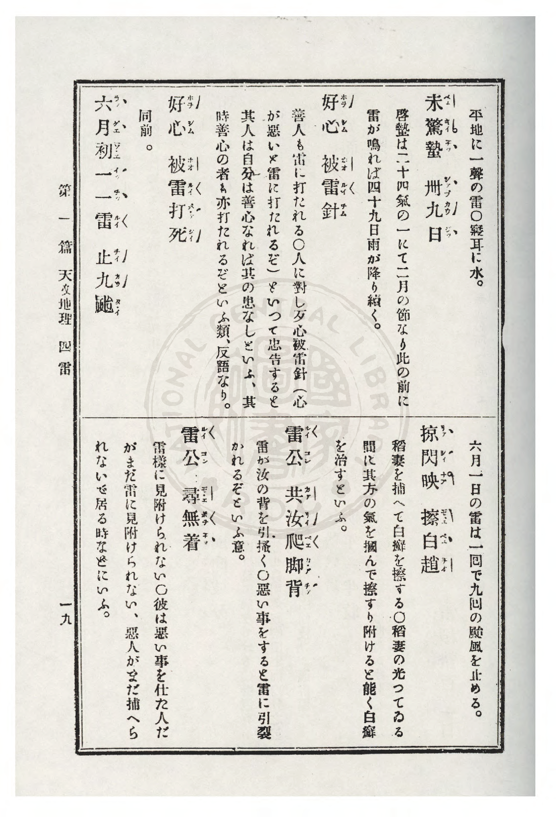 | 232 | 六月初一一雷止九颱 | La̍k goe̍h chhe it nā tânlûi chi̍t pái, ētàng chó͘chí káuê hongthai. | 六月初一若tân雷一pái,ē tàng阻止九个風颱。 | La̍k goe̍h chhe it chi̍t lûi chí káu thai | 雷 | Lûi | 原冊掃描 |