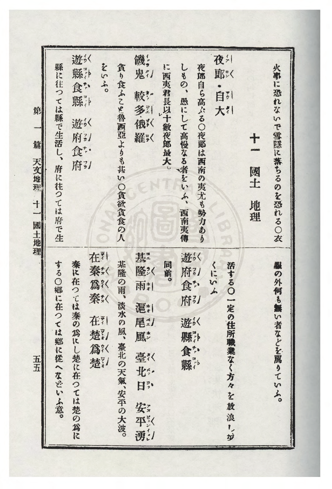 | 365 | 夜郎 自大 | Iālông chūtāi. | 夜郎是漢代西南邊境ê一个小國。「夜郎自大」指夜郎國王妄自尊大。後來用「夜郎自大」比喻人見識短淺,狂妄自大。 | Iā lông sī Hàn tāi sailâm piankéng ê chi̍tê sió kok."iā lông chūtāi"chí iā lông kokông bōng chū chuntōa. Āu lâi ēng"iā lông chūtāi"píjū lâng kiànsek té chhián, kôngbōng chūtāi. | 國土 地理 | KokThó TēLí | 原冊掃描 |