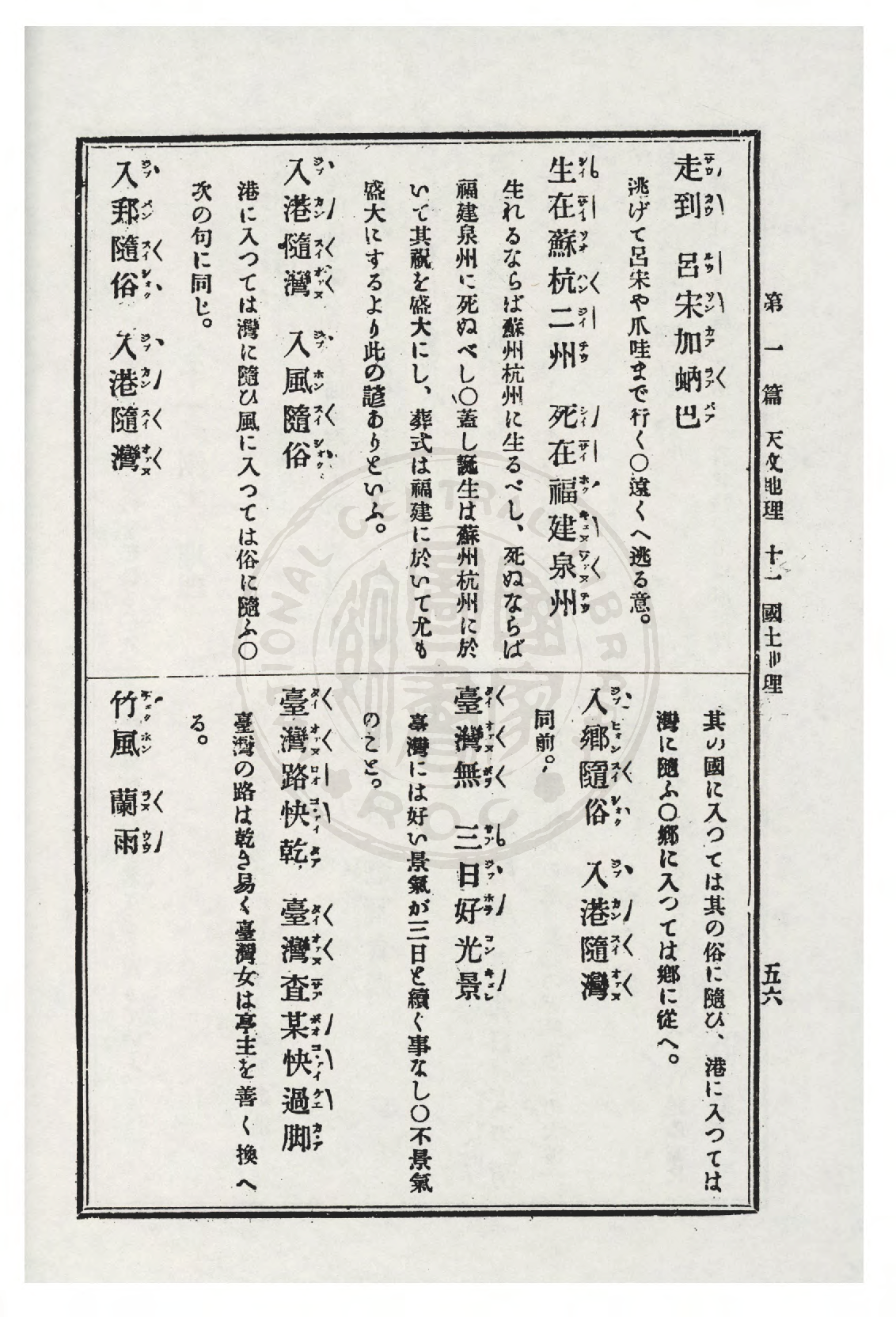 | 378 | 竹風 蘭雨 | Tekhong lânú. | 新竹出名透風,宜蘭出名落雨。 | Sintek chhutmiâ thàu hong, Gîlân chhutmiâ lo̍hhō͘. | 國土 地理 | KokThó͘ TēLí | 原冊掃描 |