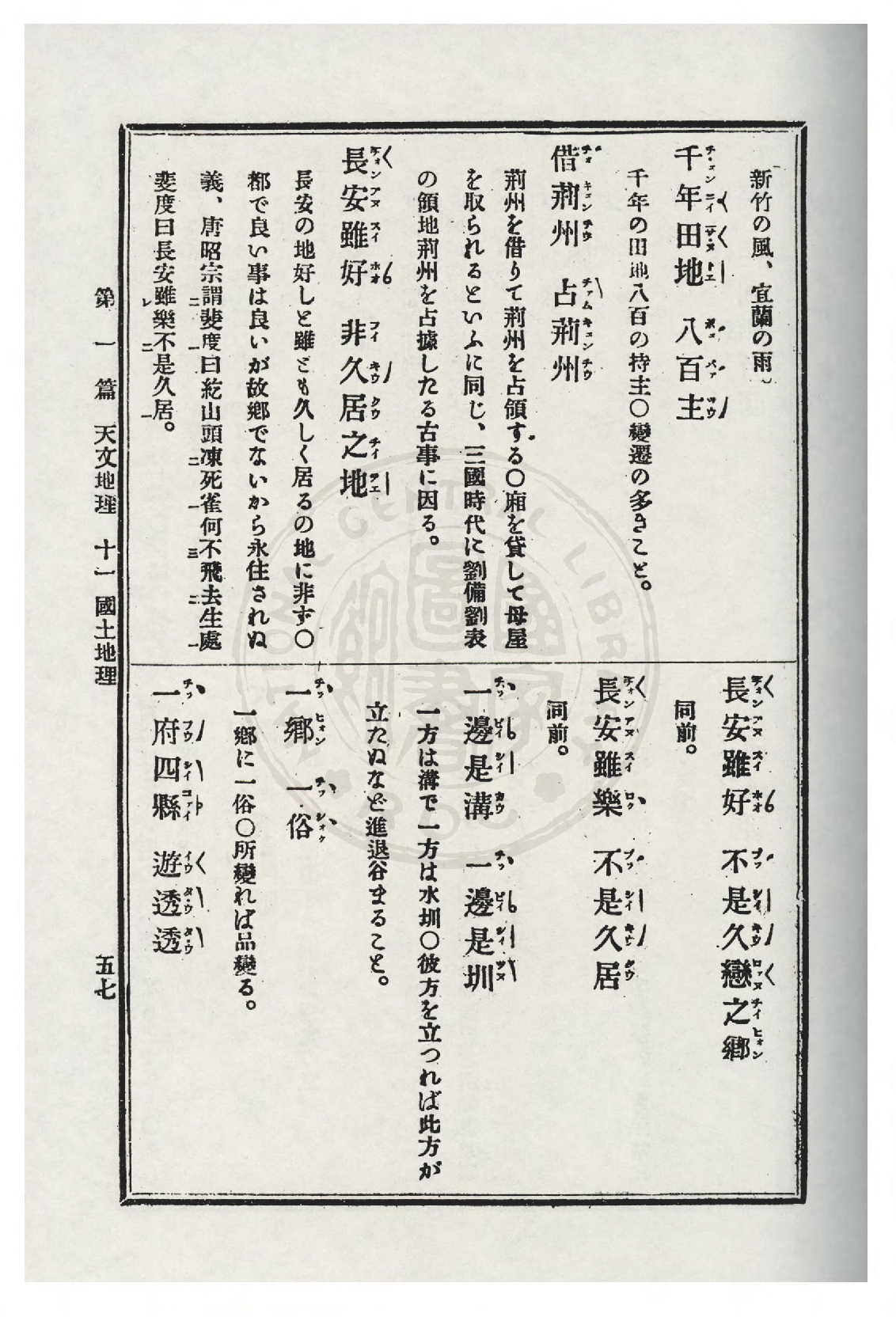 | 383 | 長安雖樂 不是久居 | Tiôngan sui lo̍k, putsī kiú ku. | Kah前條仝。 | Kah chêng tiâu kâng. | 國土 地理 | KokThó͘ TēLí | 原冊掃描 |
