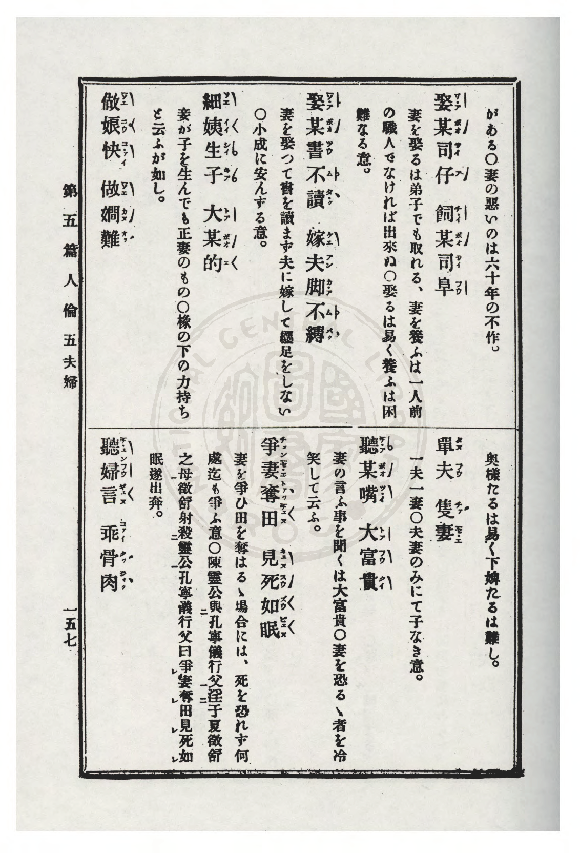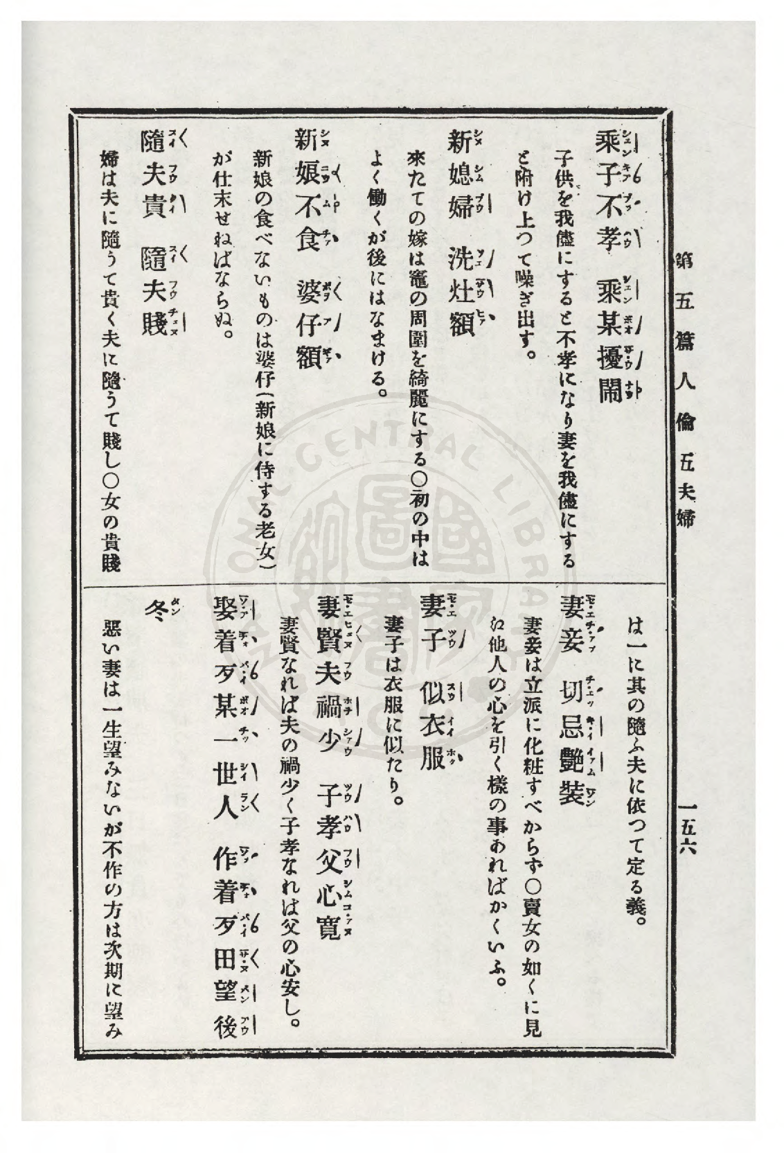 | 1101 | 妻賢夫禍少 子孝父心寬 | Chhe hiân hu hō siáu, chú hàu hū sim khoan. | Bó͘若賢慧,翁to̍h ē khah少災禍:kiáⁿ若有孝,老父to̍h ē放心。 | Bó͘ nā hiânhōe, ang to̍h ē khah chió chaihō, kiáⁿ nā iúhàu, lāupē to̍h ē hòngsim. | 夫婦 | Huhū | 原冊掃描 |